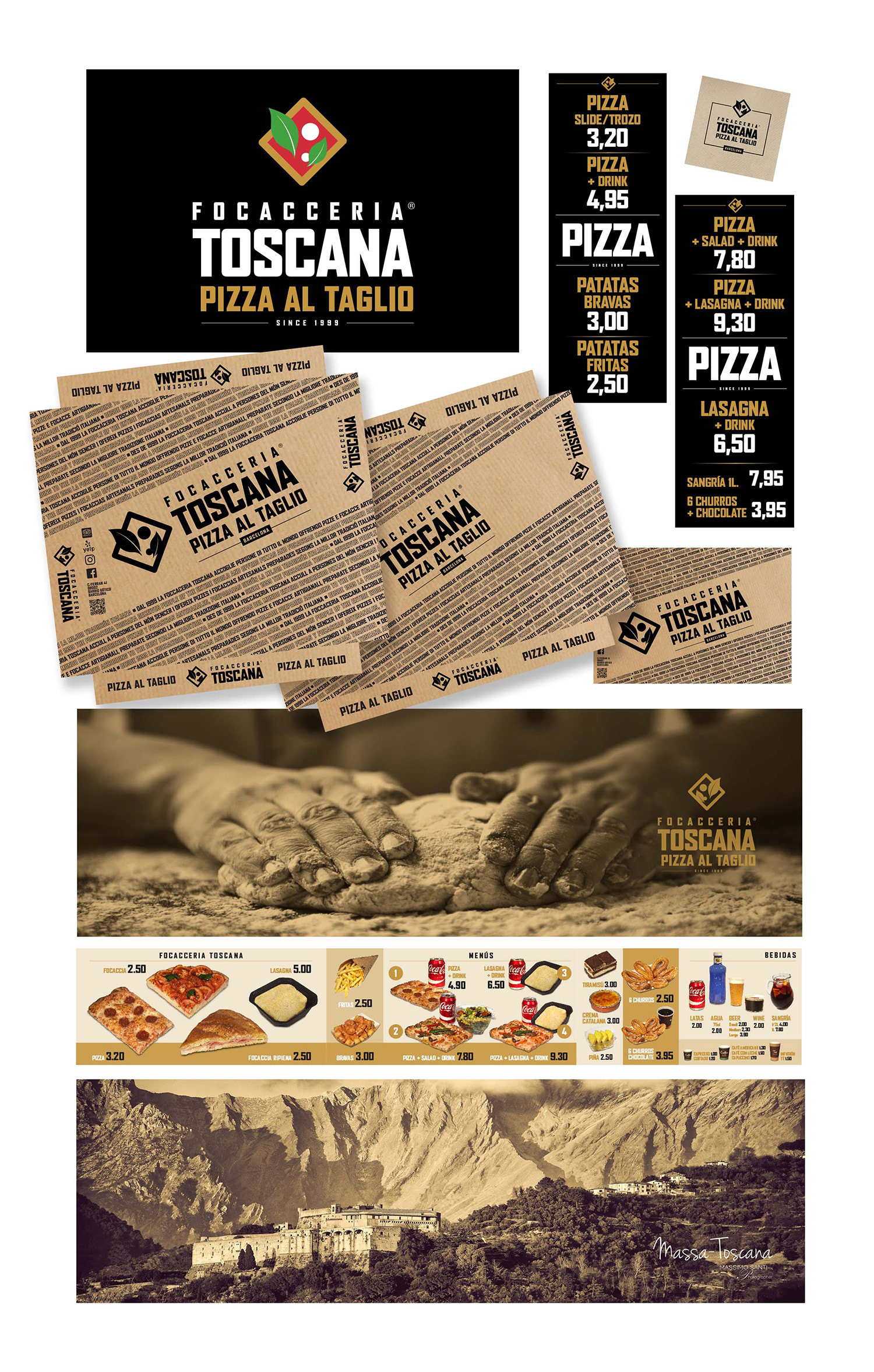 Diseño e nuevo logotipo para Foccaceria Toscana de Barcelona. Desarrollo de manual de identidad gráfica, e implantación de nueva marca en reforma de local. Desarrollo y producción de gigantografías para paredes. Sesión fotográfica para cartel de productos. Diseño de packaging. Diseño de cartelería interior y concepto de imágenes para cuadros interiores decorativos .