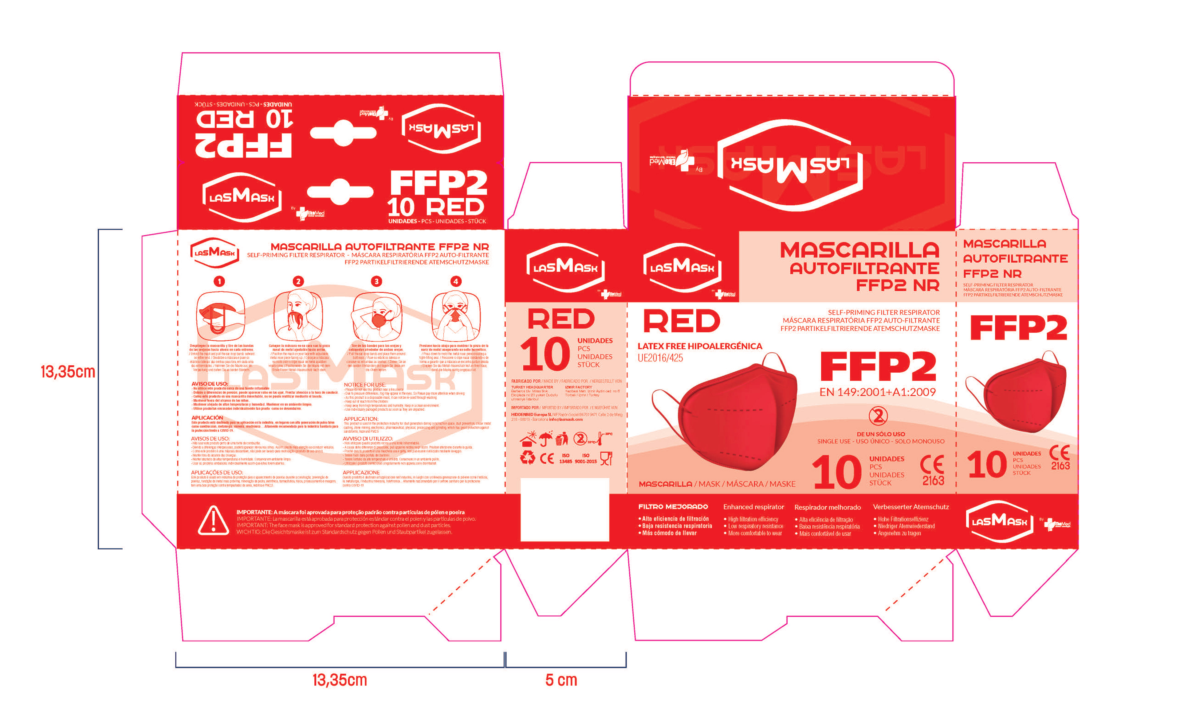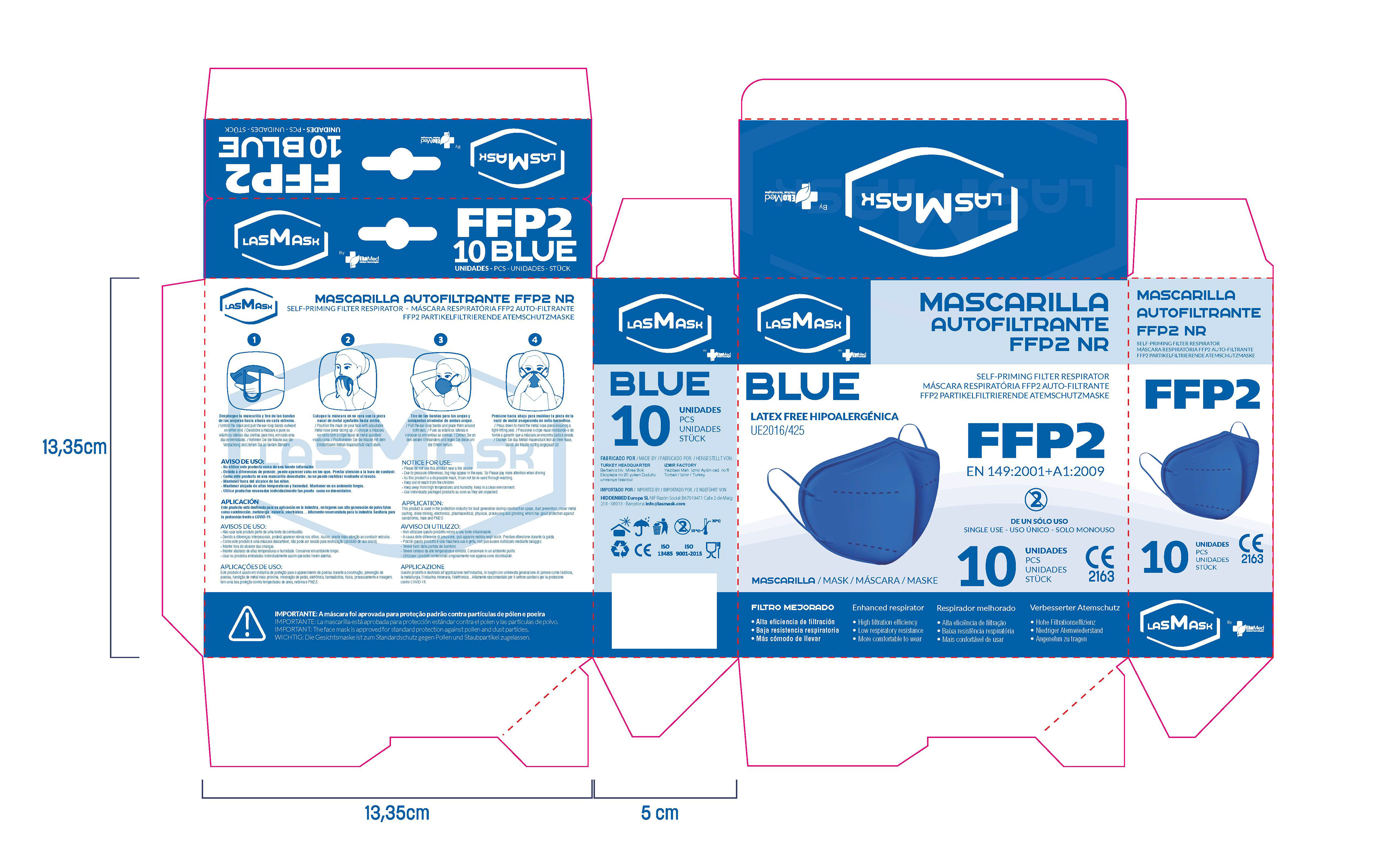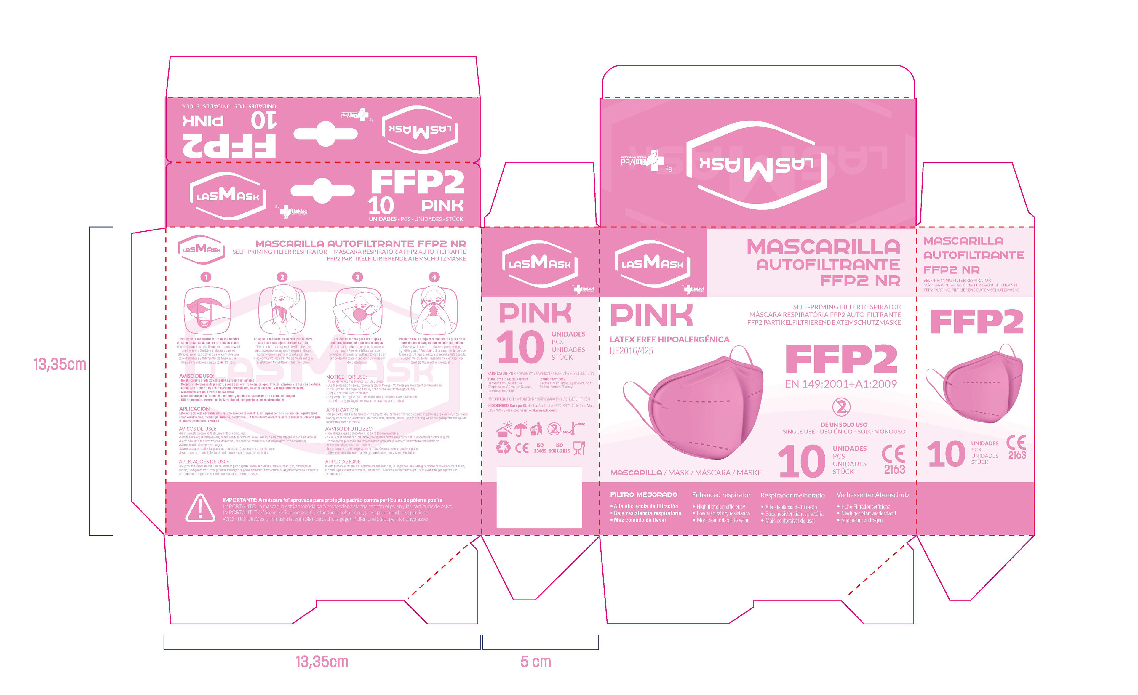 Diseño de packaging para mascarillas FFP2 de distintos colores.